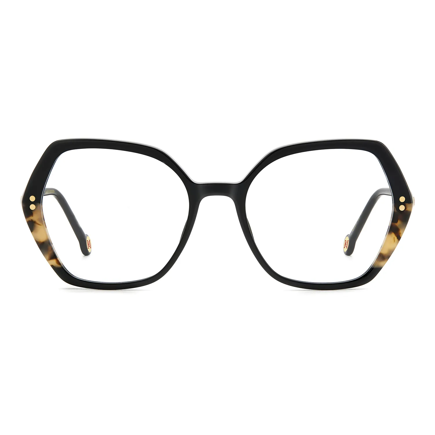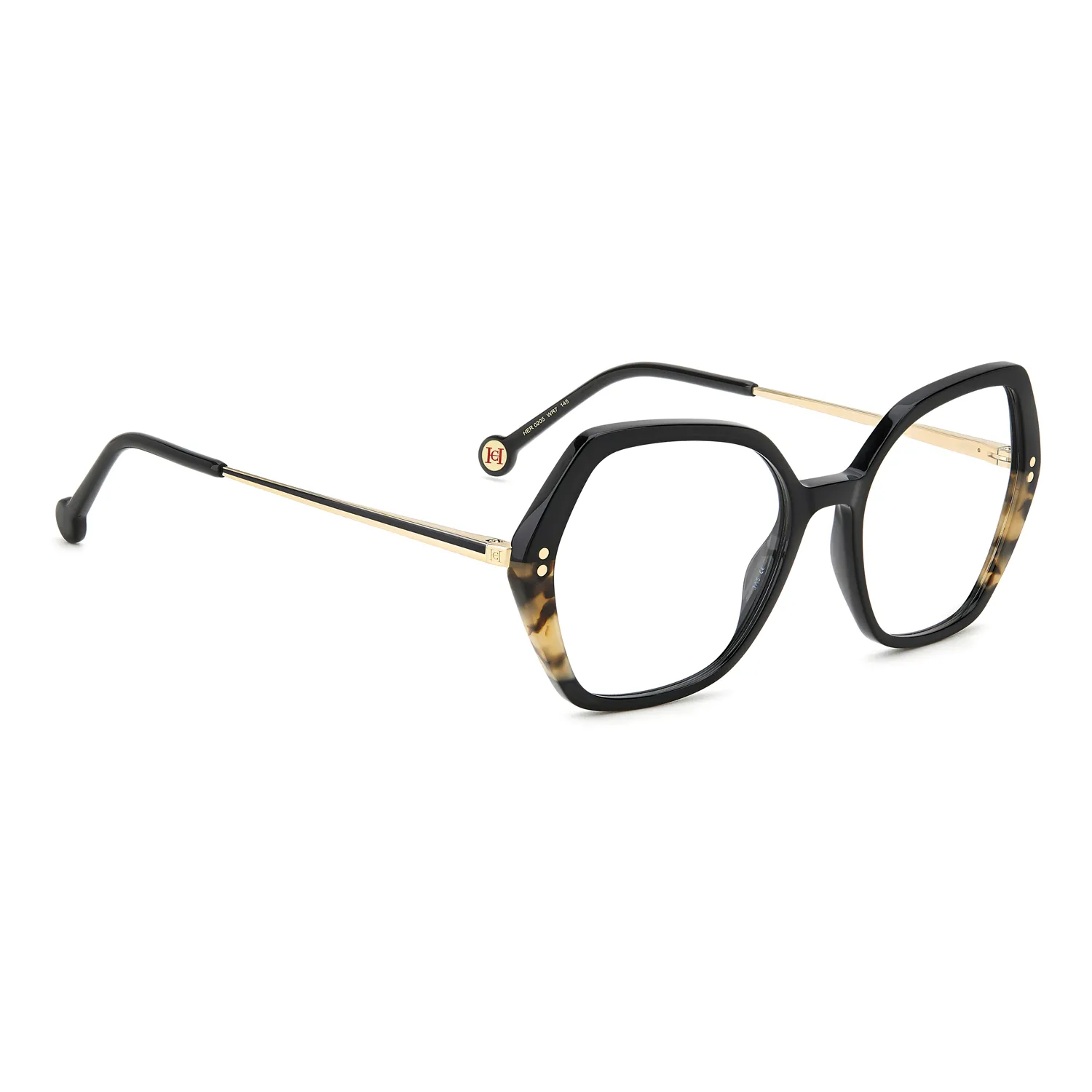 - Carolina Herrera HER 0205 WR7: Frontal negro sólido con detalles Havana en los laterales y varillas metálicas doradas. Calibre 52 mm.