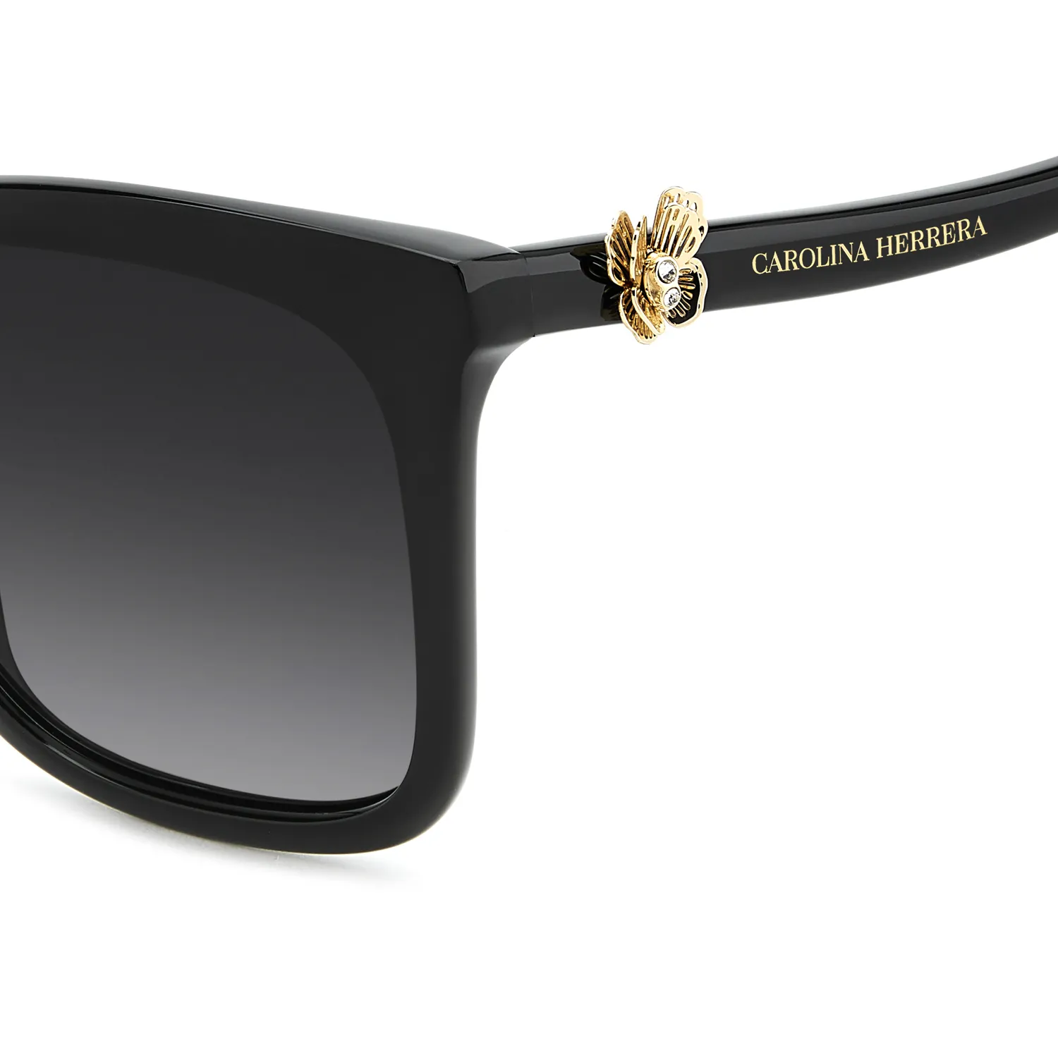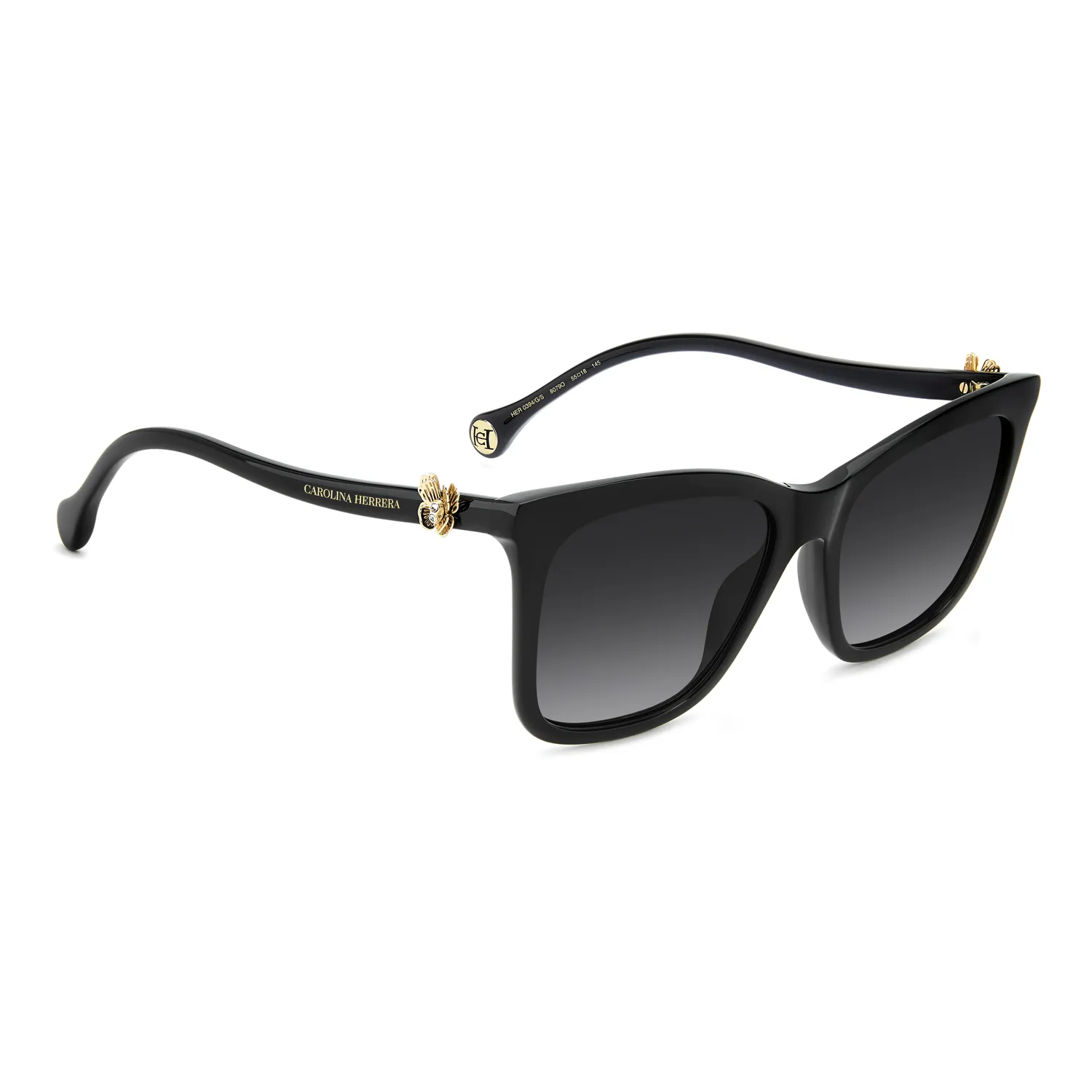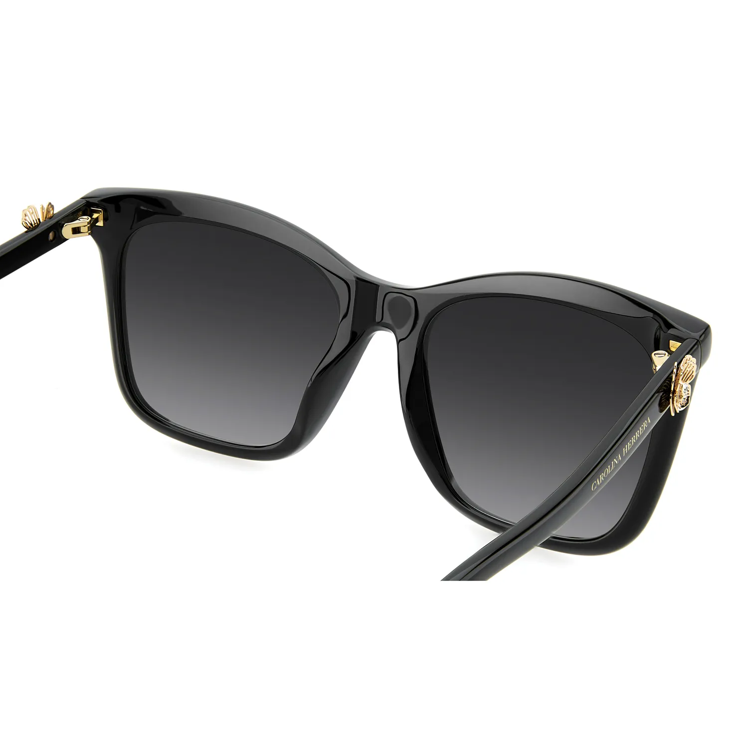 - Carolina Herrera HER 0394/G/S 807 9O: Frontal en negro pulido con detalles de pedrería y lentes en gris degradado. Calibre 54 mm.