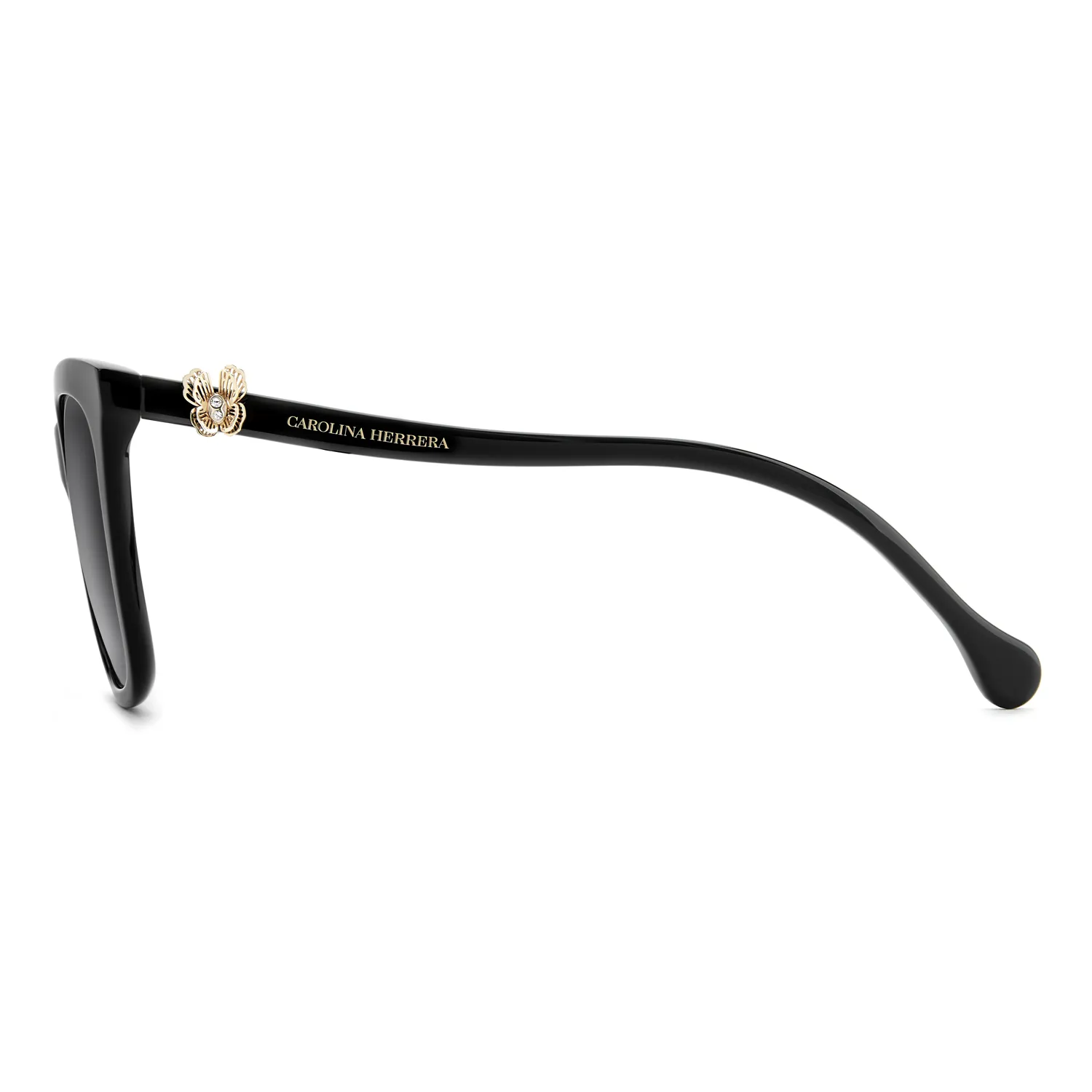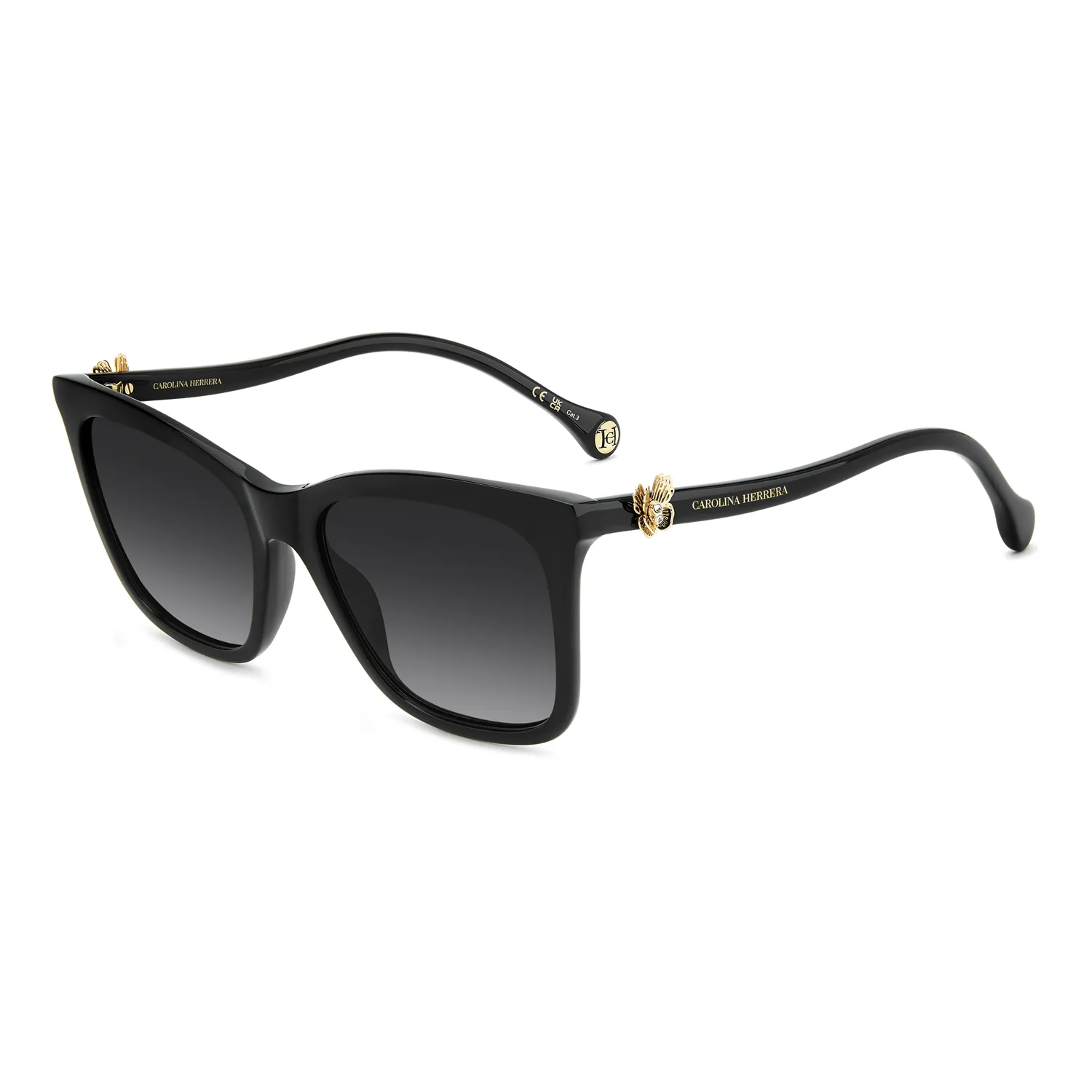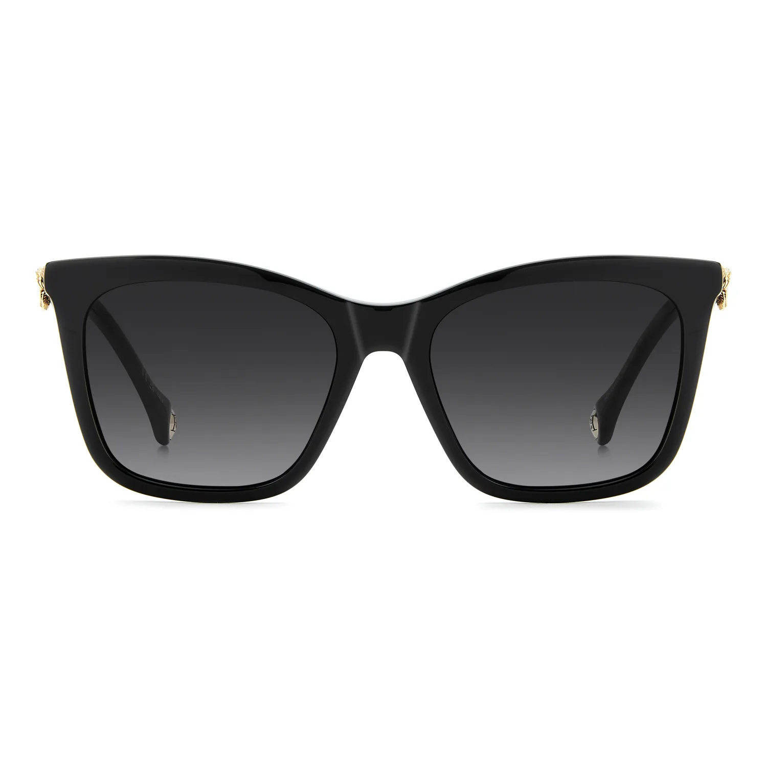 - Carolina Herrera HER 0394/G/S 807 9O: Frontal en negro pulido con detalles de pedrería y lentes en gris degradado. Calibre 54 mm.