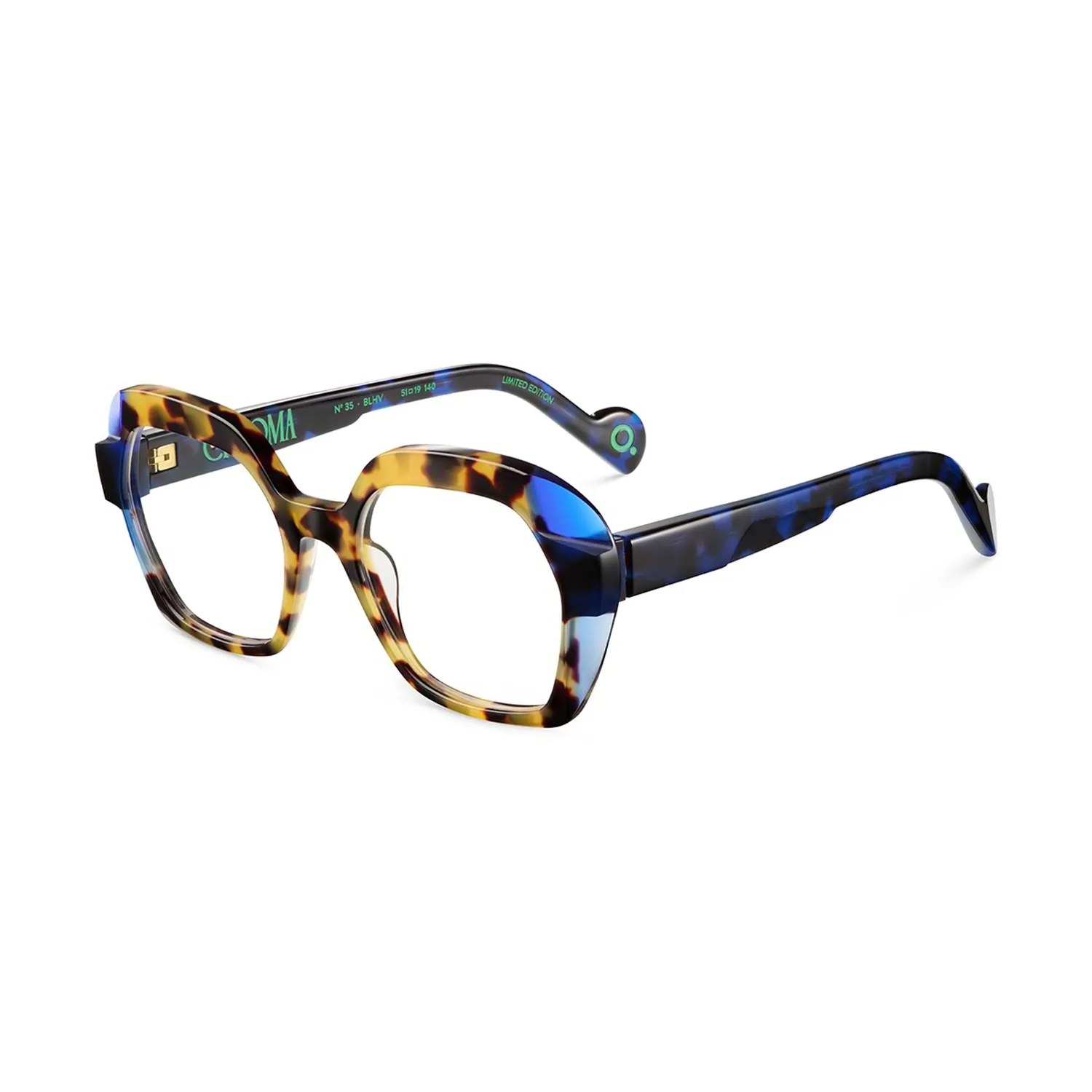 El modelo Chroma 035 BLHV de Etnia Barcelona es una pieza de diseño que combina una estructura arquitectónica con una paleta de colores vibrante y sofisticada. Esta montura destaca por su silueta hexagonal suavizada, fabricada en acetato natural de alta densidad que permite perfiles finos pero con una gran presencia visual. La combinación BLHV presenta un frontal en azul translúcido que se funde con varillas en acabado havana (carey), creando un contraste moderno que aporta luz y carácter a la mirada.