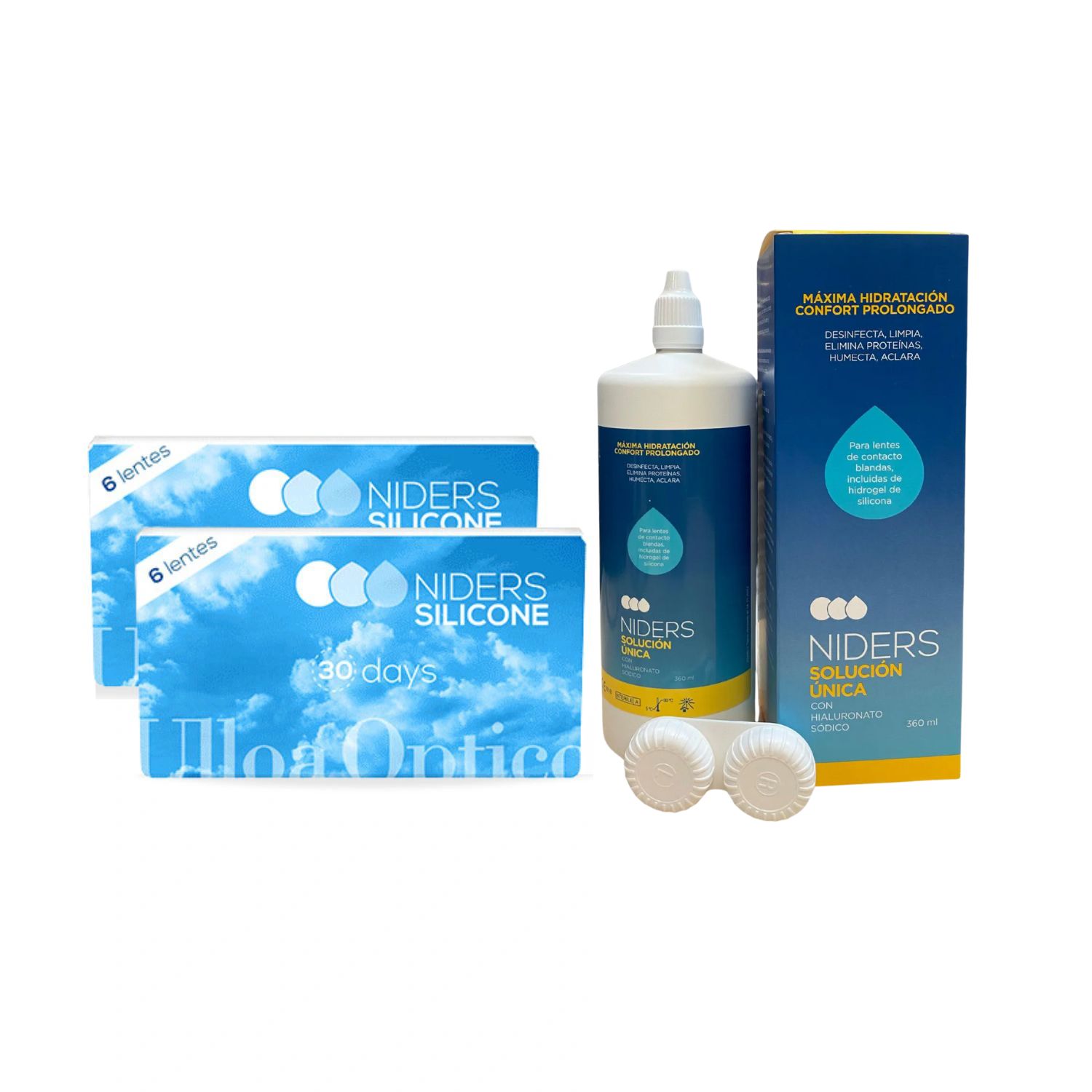 - 2 Soluciones Únicas Niders (360 ml): Para la limpieza, desinfección e hidratación diaria.